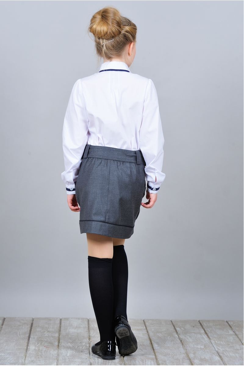 Оригинальная блузка прямого силуэта с длинными рукавами и отложным воротником. Модель застегивается на пуговицы, планка дополнена нарядными оборками. Воротник и манжеты декорированы контрастной тесьмой и такого же цвета несъемным галстуком-бантом.