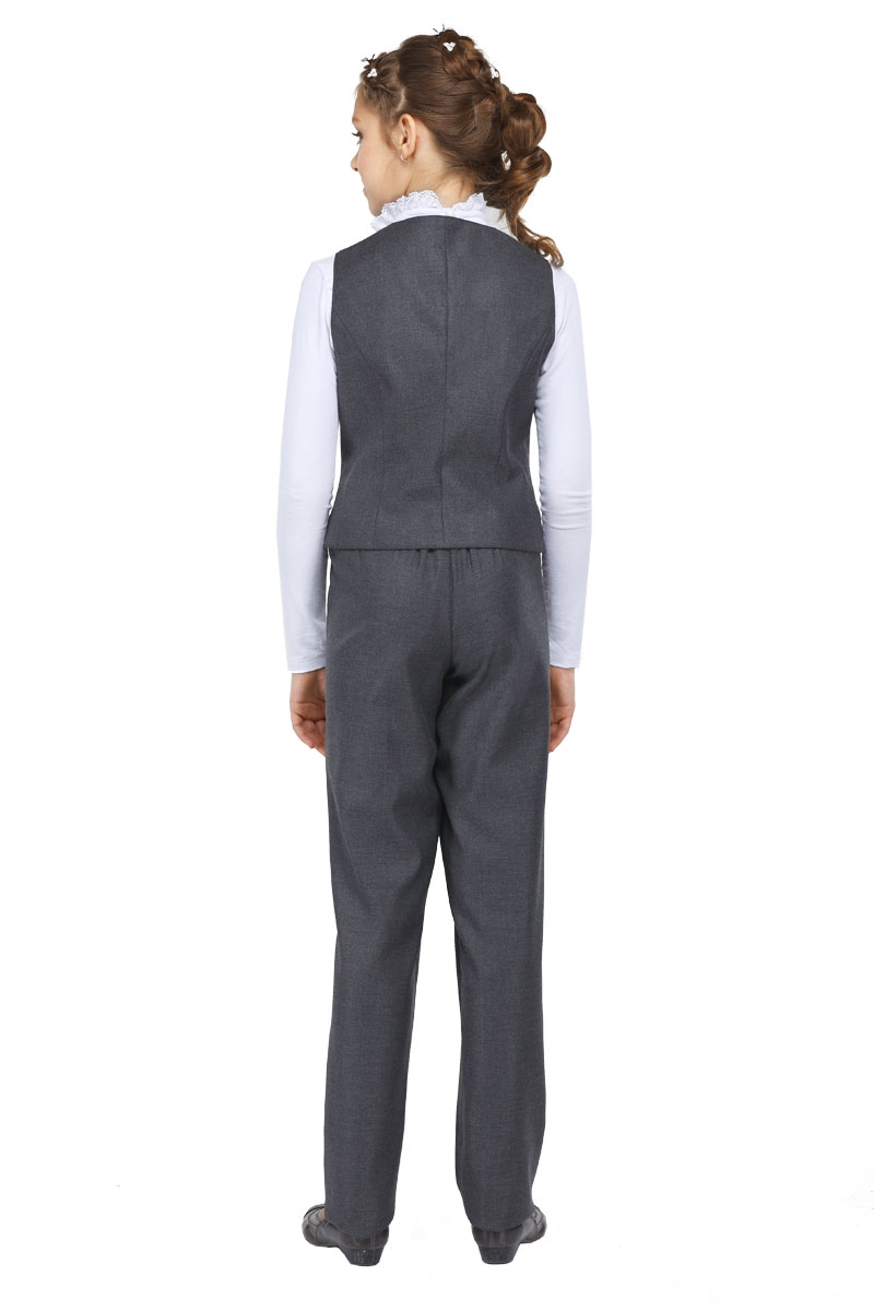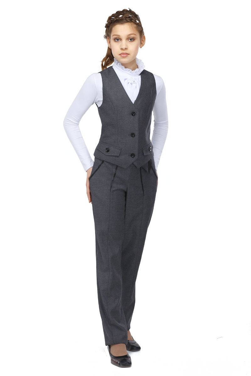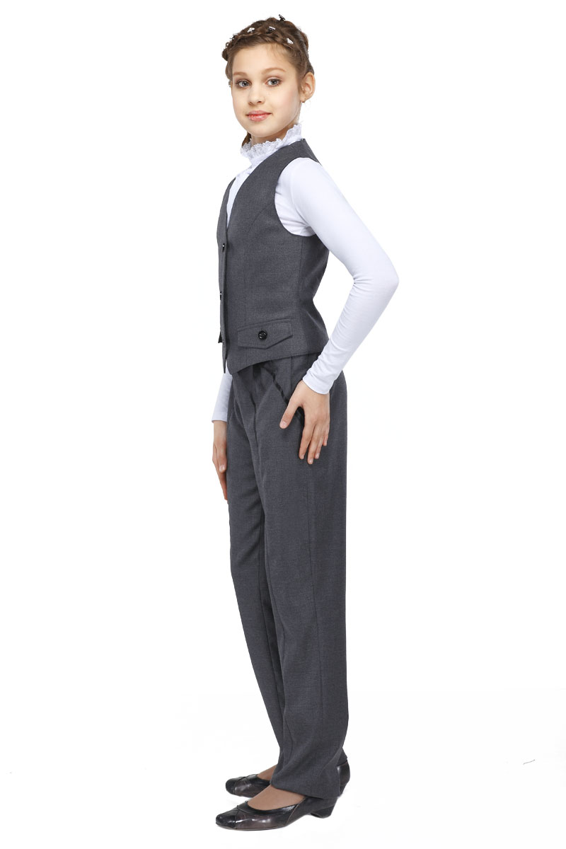 Классический школьный жилет приталенного силуэта для девочек. Модель с V-образным вырезом и ассиметричным низом застегивается на пуговицы. По бокам изделие декорировано клапанами на пуговицах.