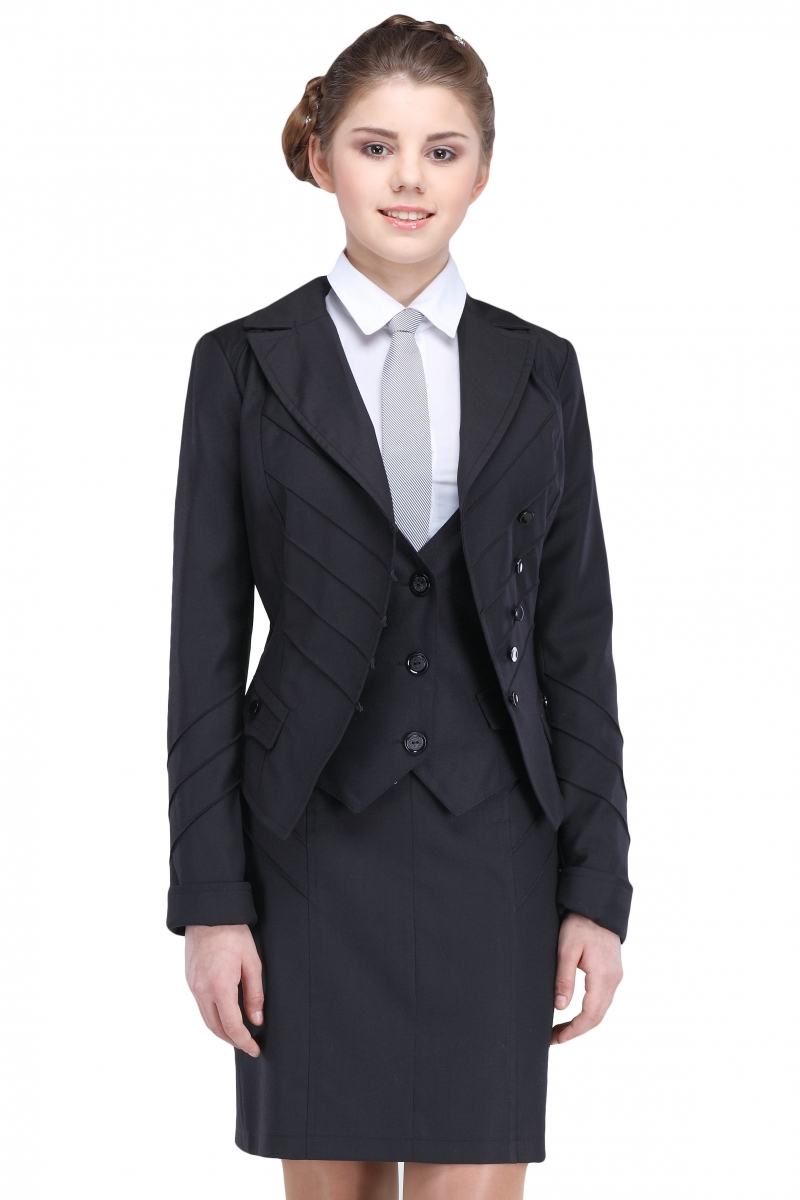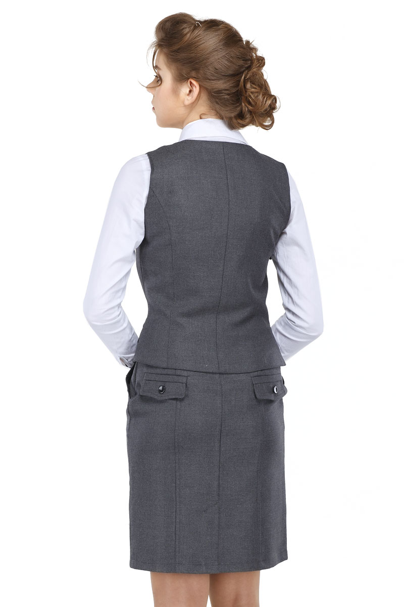 Классический школьный жилет приталенного силуэта для девочек. Модель с V-образным вырезом и ассиметричным низом застегивается на пуговицы. По бокам изделие декорировано клапанами на пуговицах.