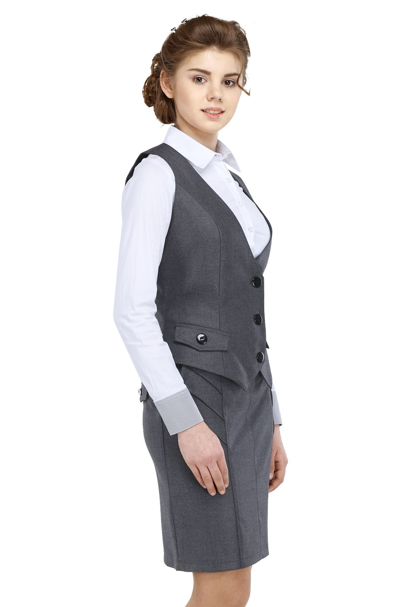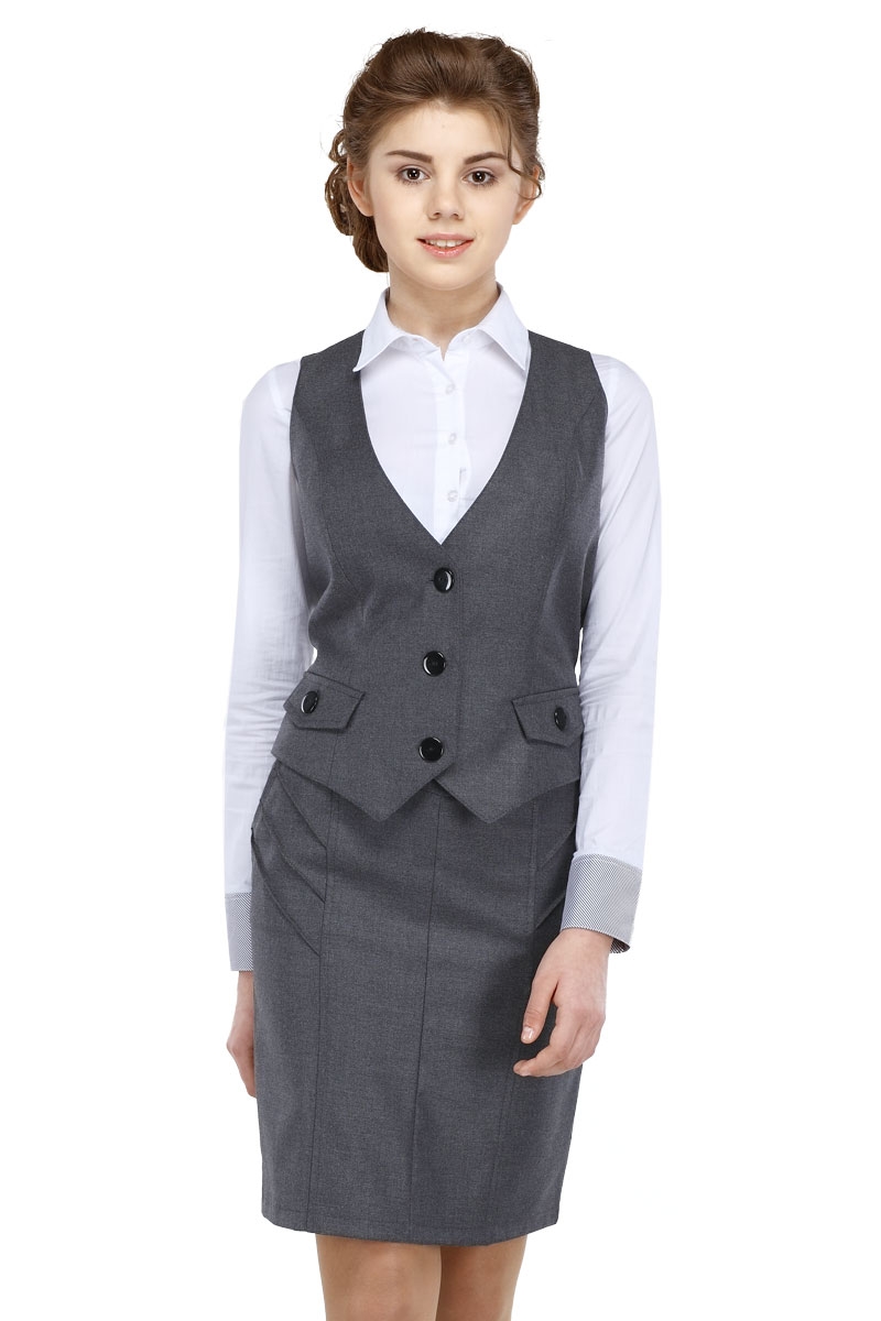 Классический школьный жилет приталенного силуэта для девочек. Модель с V-образным вырезом и ассиметричным низом застегивается на пуговицы. По бокам изделие декорировано клапанами на пуговицах.