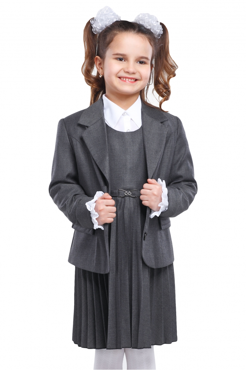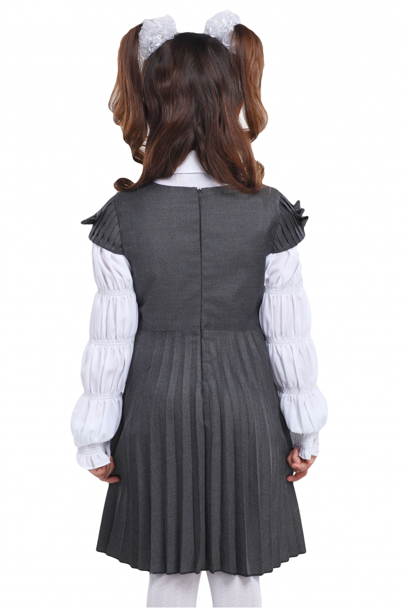 Стильный школьный сарафан А-силуэта. Модель с рукавами-фонариками, округлым вырезом горловины застегивается на спинке на скрытую молнию. Завышенная талия подчеркнута небольшим настроченным поясом, низ сарафана оформлен складками «плиссе». Рукава декорированы вертикальными складками и бантиками.