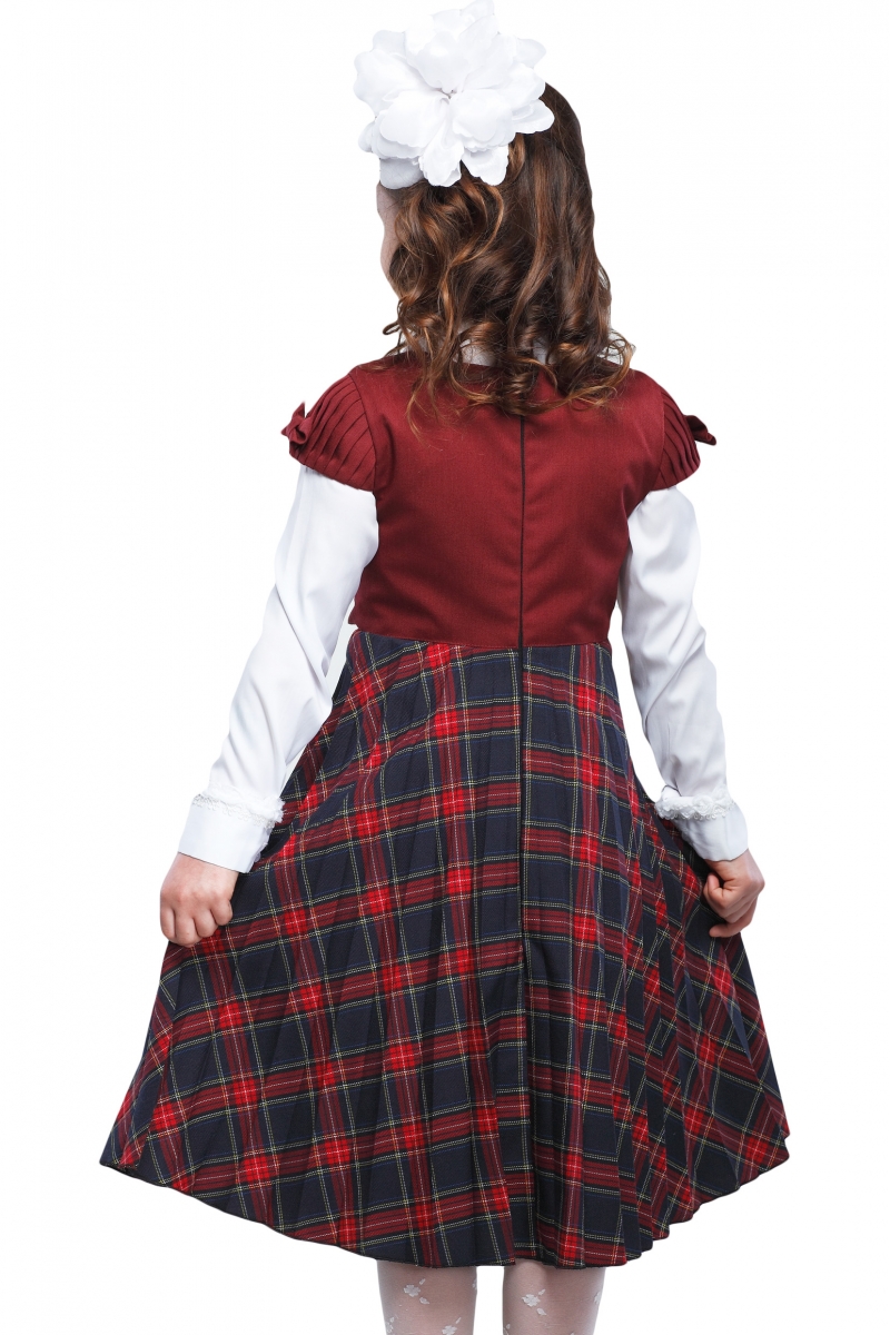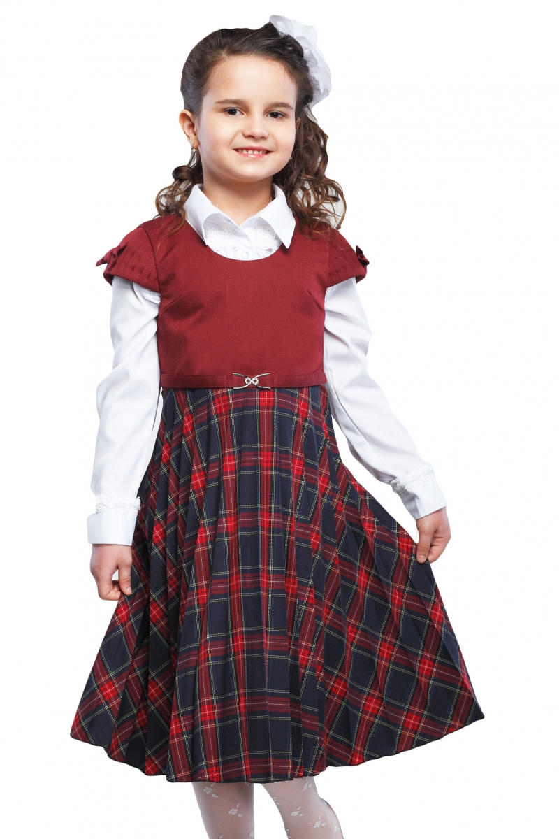 Стильный школьный сарафан А-силуэта. Модель с рукавами-фонариками, округлым вырезом горловины застегивается на спинке на скрытую молнию. Завышенная талия подчеркнута небольшим настроченным поясом, низ сарафана оформлен складками «плиссе». Рукава декорированы вертикальными складками и бантиками.