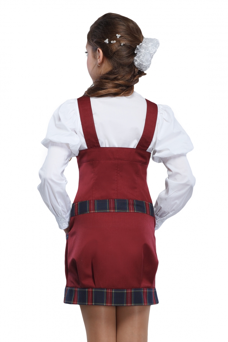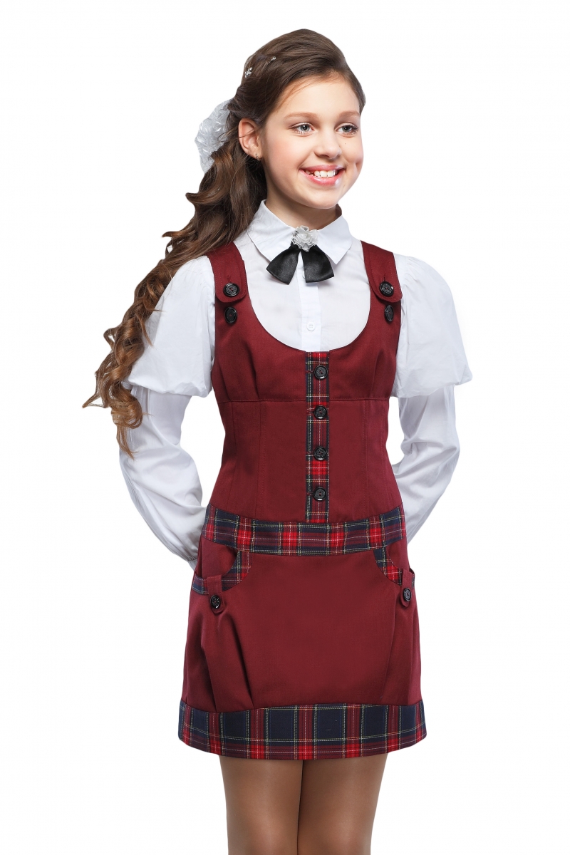 Оригинальный школьный сарафан приталенного силуэта со шлейками на пуговицах. Полочка оформлена круглым вырезом, фигурными рельефами и застежкой на пуговицы по центру. Низ изделия присобран, образуя крупные встречные складки. Сарафан дополнен двумя боковыми карманами с патами на пуговицах.