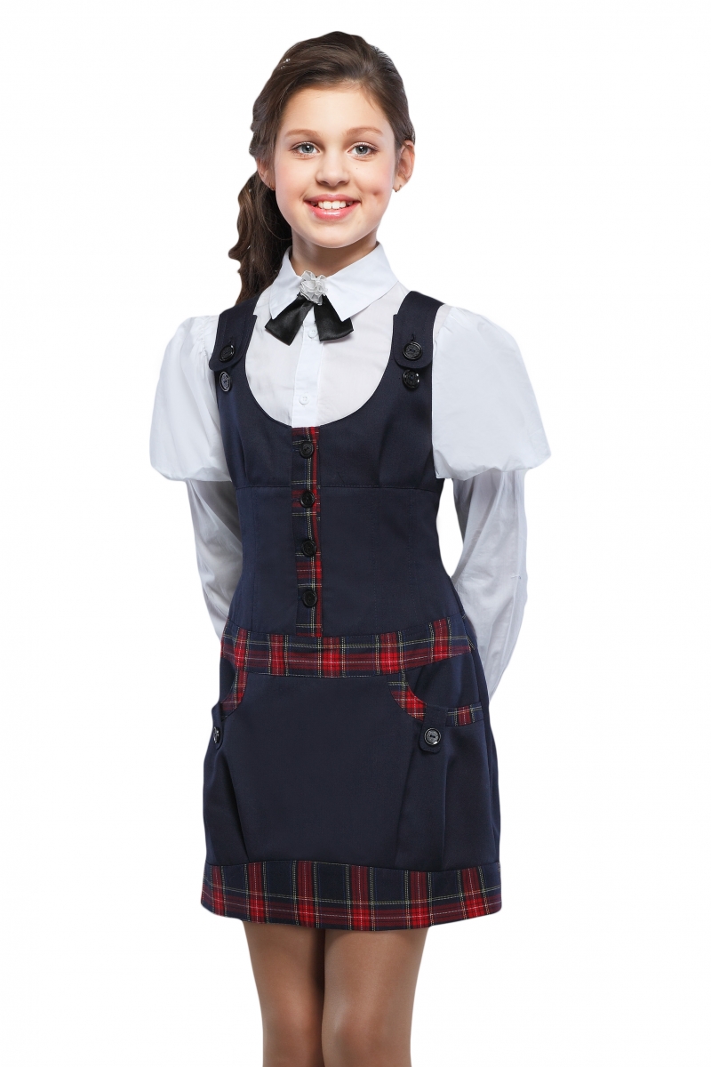 Оригинальный школьный сарафан приталенного силуэта со шлейками на пуговицах. Полочка оформлена круглым вырезом, фигурными рельефами и застежкой на пуговицы по центру. Низ изделия присобран, образуя крупные встречные складки. Сарафан дополнен двумя боковыми карманами с патами на пуговицах.