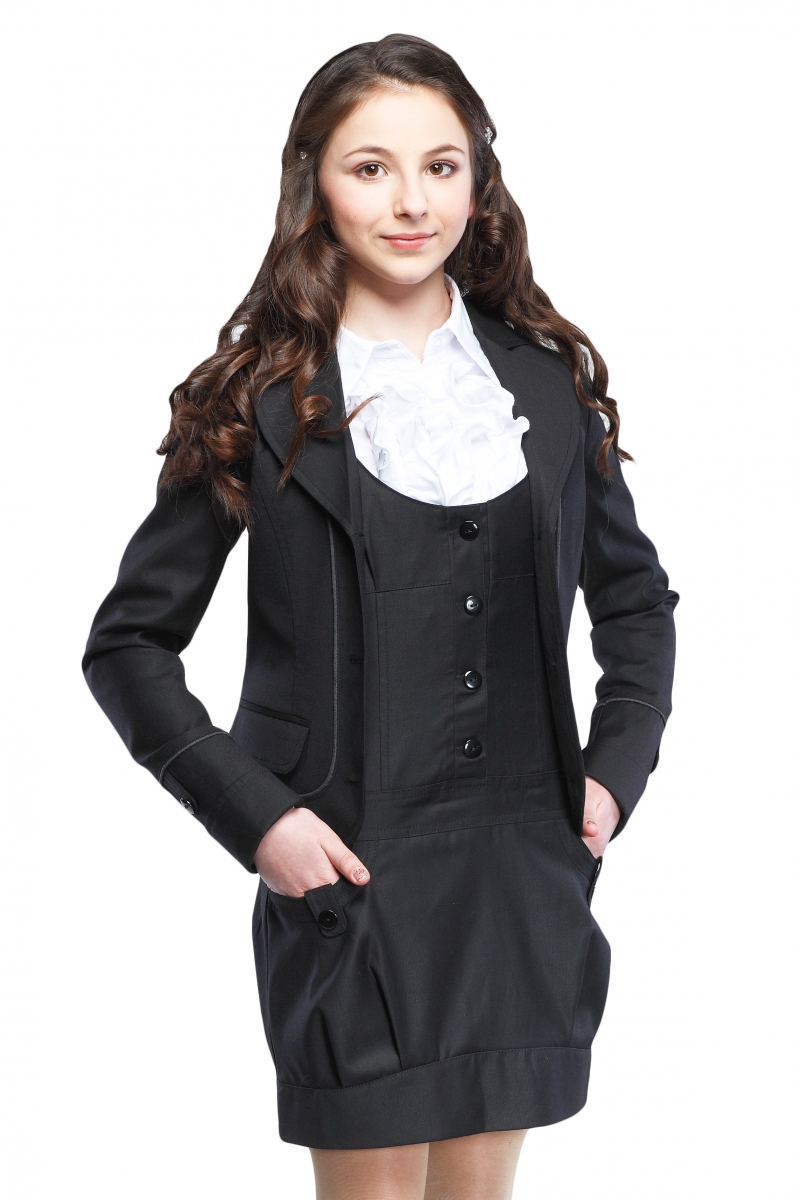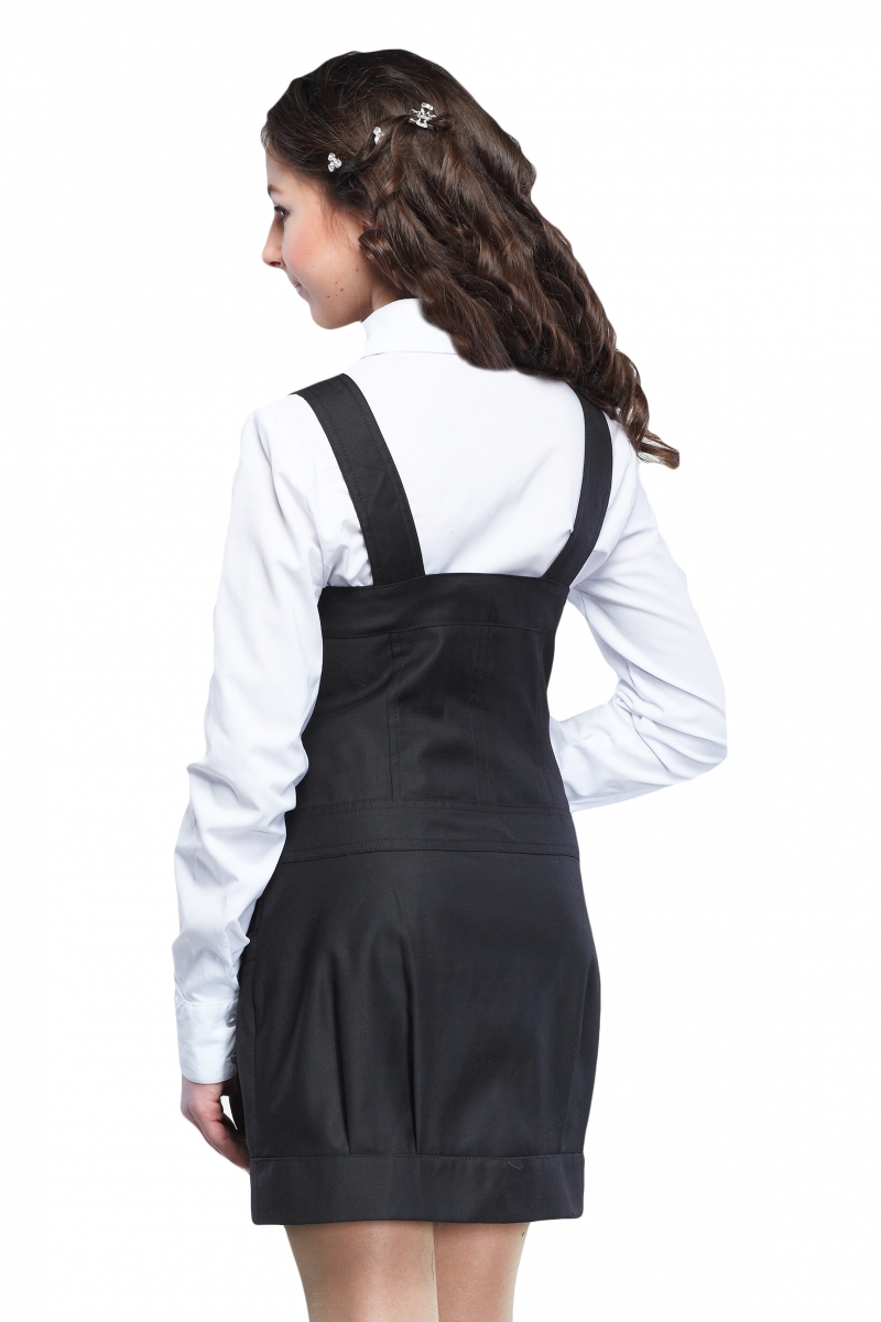 Оригинальный школьный сарафан приталенного силуэта со шлейками на пуговицах. Полочка оформлена круглым вырезом, фигурными рельефами и застежкой на пуговицы по центру. Низ изделия присобран, образуя крупные встречные складки. Сарафан дополнен двумя боковыми карманами с патами на пуговицах.