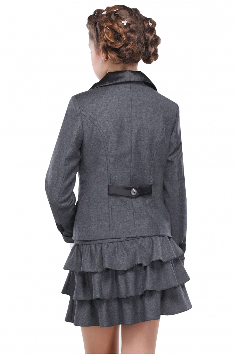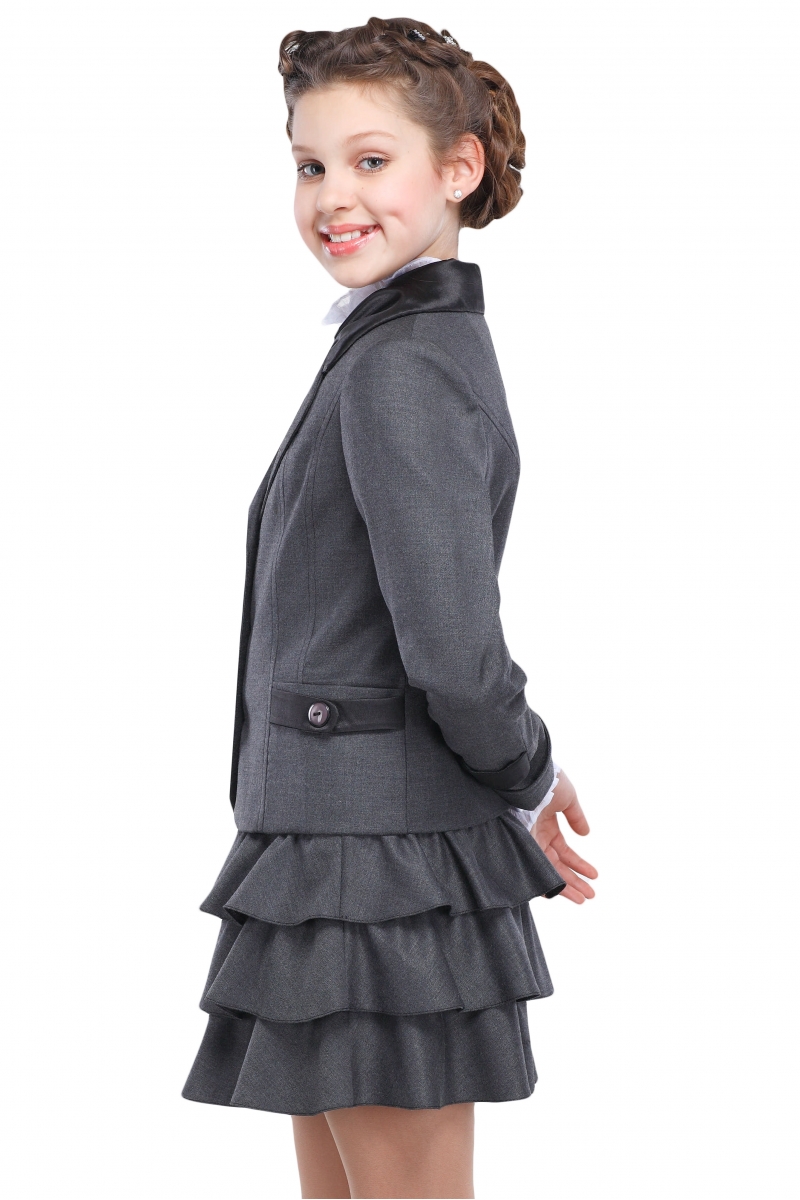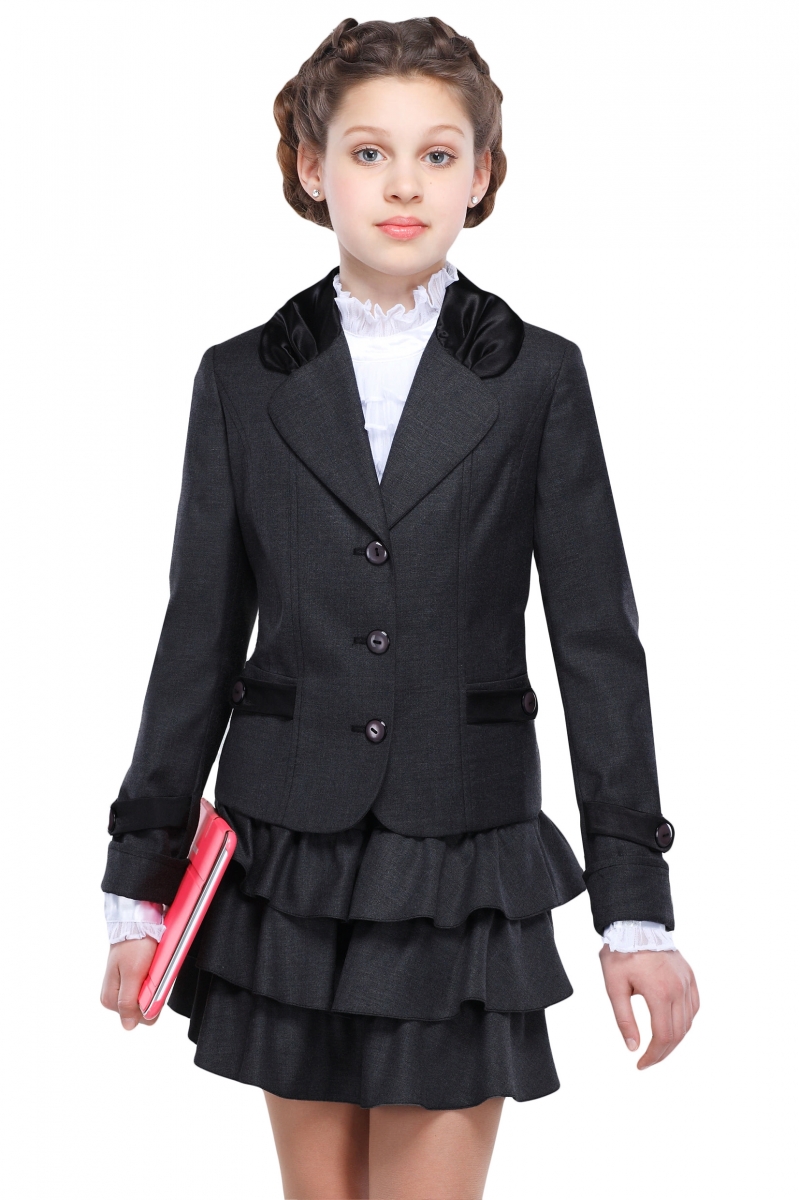 Стильный костюм двойка для девочек. Пиджак полуприталенного фасона для девочек. Модель с отложным округлым воротником, длинными рукавами с манжетами дополнена двумя врезными карманами. Изделие застегивается на пуговицы. Воротник, листочки на карманах и паты на рукавах выполнены из атласной ткани.