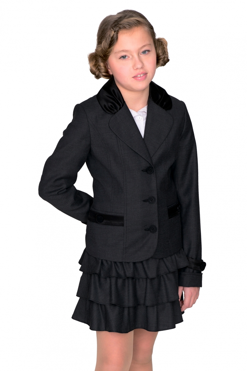 Пиджак полуприталенного фасона для девочек.  Модель с отложным округлым воротником, длинными рукавами с манжетами дополнена двумя врезными карманами. Изделие застегивается на пуговицы. Воротник, листочки на карманах и паты на рукавах выполнены из атласной ткани.