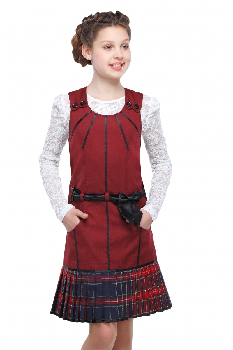 Оригинальный школьный сарафан А-силуэта с плиссированным низом. Модель с округлым вырезом спереди и V-образным вырезом на спинке застегивается на потайную молнию. Декоративный пояс-бант, продетый в шлевки, выполнен из атласной ткани и по бокам дополнен патами на пуговицах. Низ и края кокетки окантованы атласной тесьмой. Изделие декорировано пуговицами на плечах и атласным бантом на спинке.