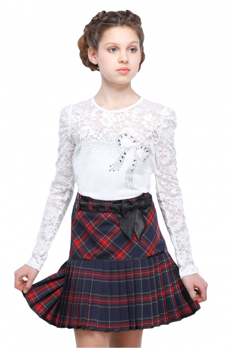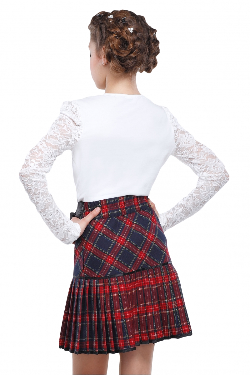 Стильная плиссированная юбка на широкой кокетке. Декоративный пояс-бант, продетый в шлевки, выполнен из атласной ткани. По бокам изделие украшено патами на пуговицах, застегивается на потайную молнию. Низ и края кокетки окантованы атласной тесьмой.