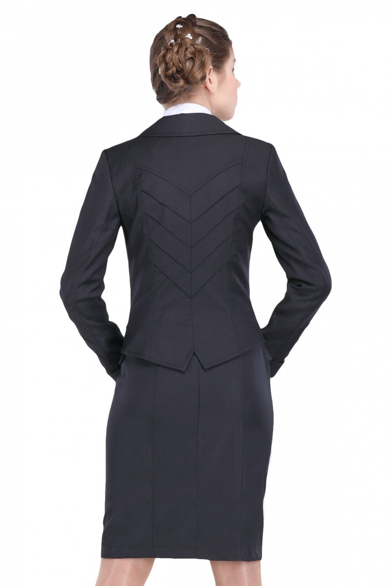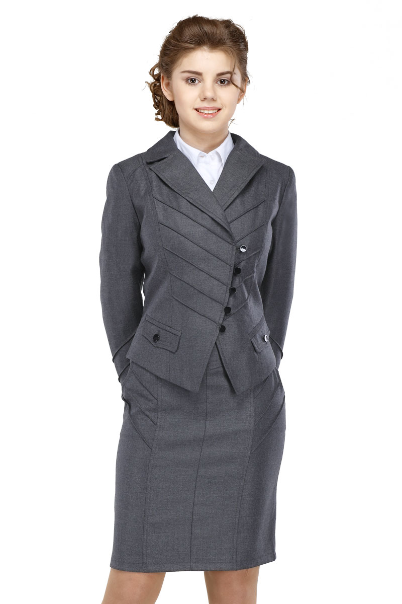 Пиджак приталенного кроя и ассиметричной длины дополнен двумя карманами с клапанами на пуговицах. Полочка изделия отличается своей оригинальностью, т.к. оформлена отложным воротником с острыми бортами и диагональной застежкой на пуговицы. Длинные рукава с манжетами, полочка и спинка декорированы встречными фигурными рельефами.