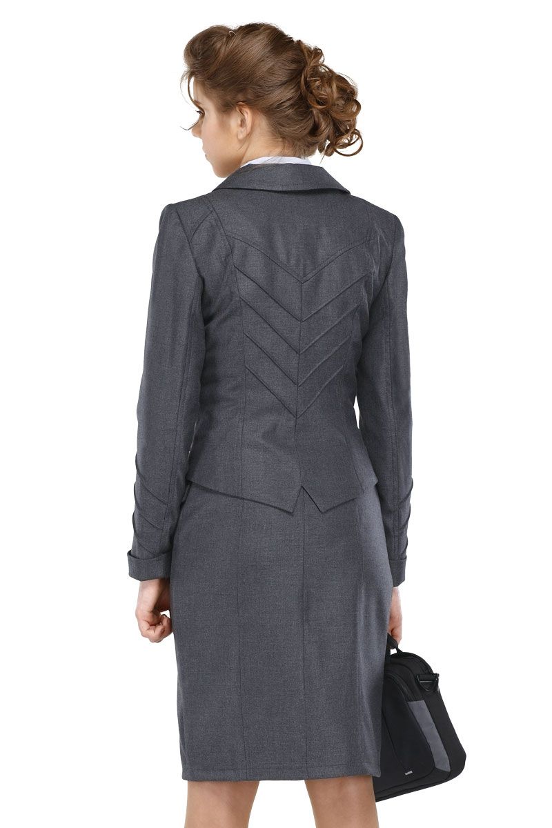 Пиджак приталенного кроя и ассиметричной длины дополнен двумя карманами с клапанами на пуговицах. Полочка изделия отличается своей оригинальностью, т.к. оформлена отложным воротником с острыми бортами и диагональной застежкой на пуговицы. Длинные рукава с манжетами, полочка и спинка декорированы встречными фигурными рельефами.