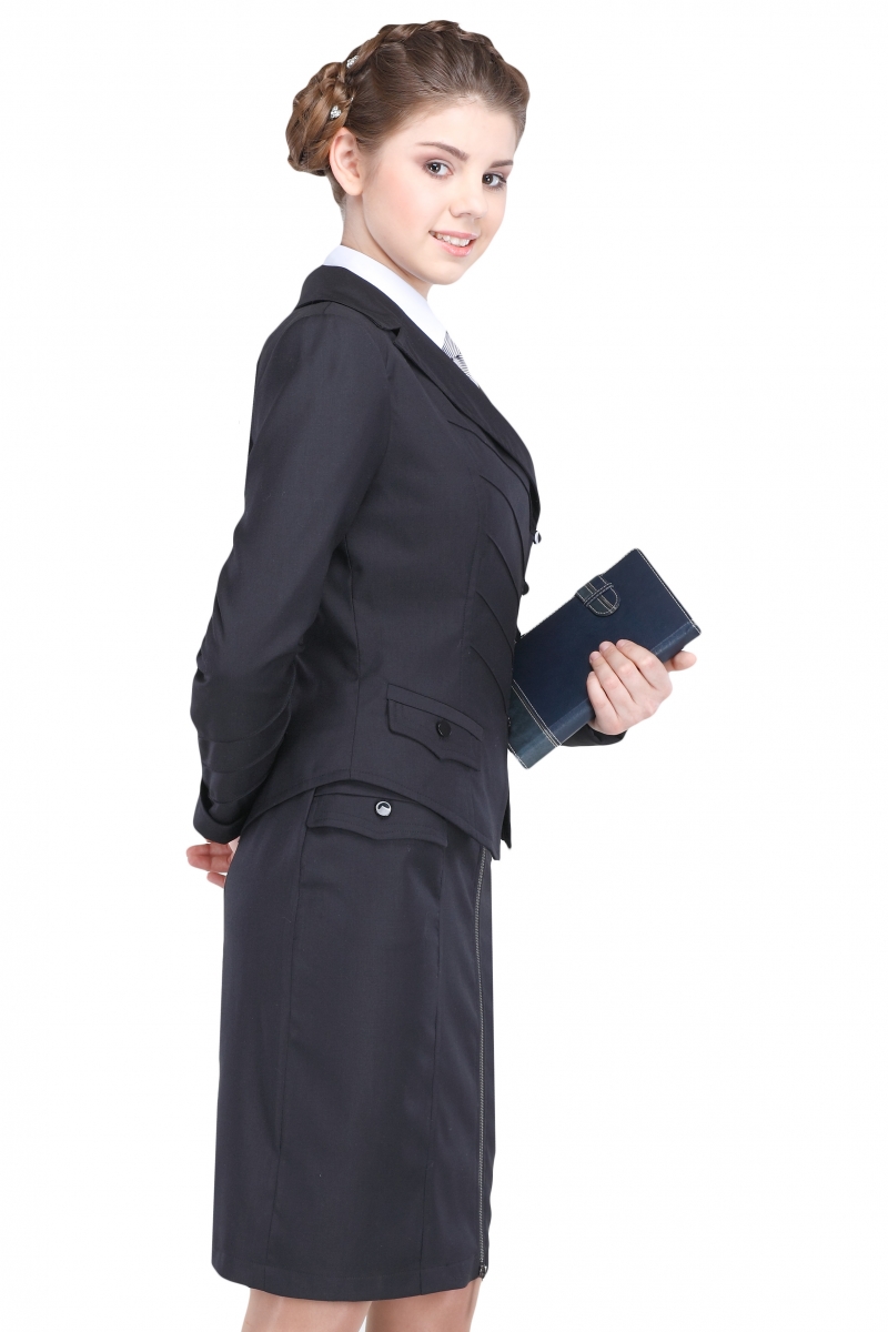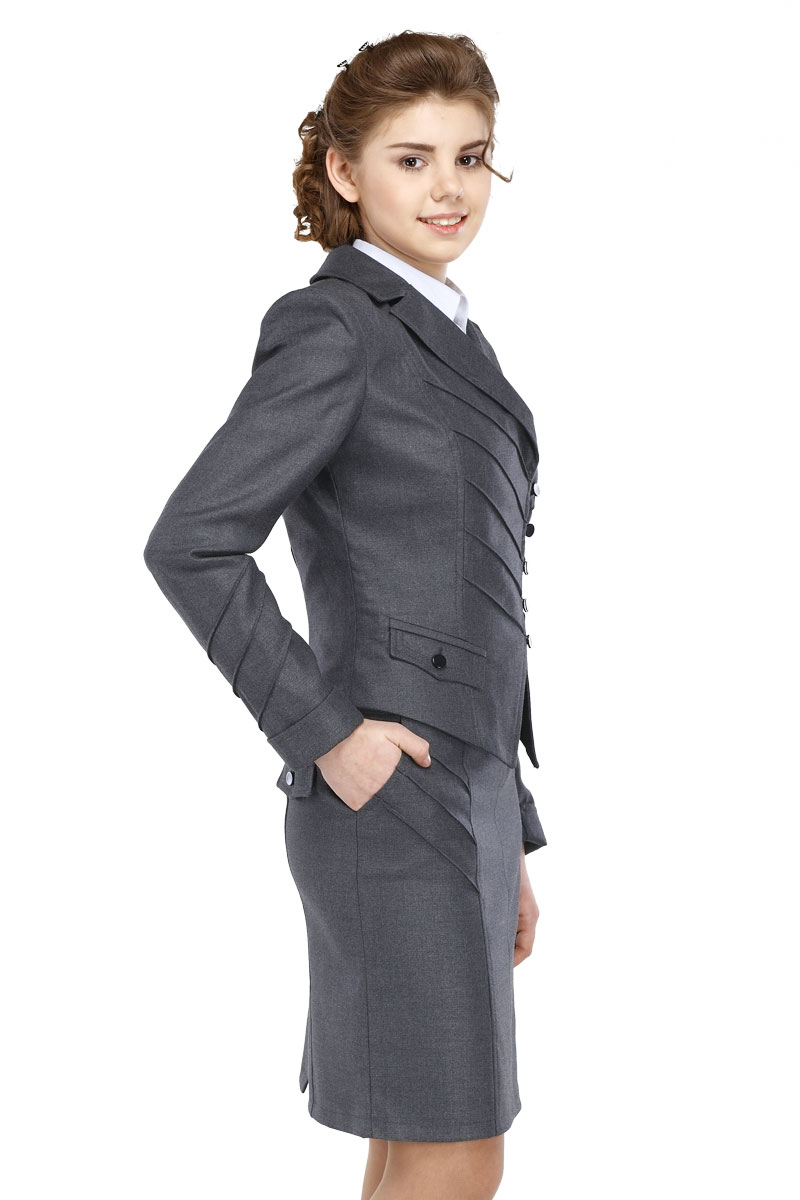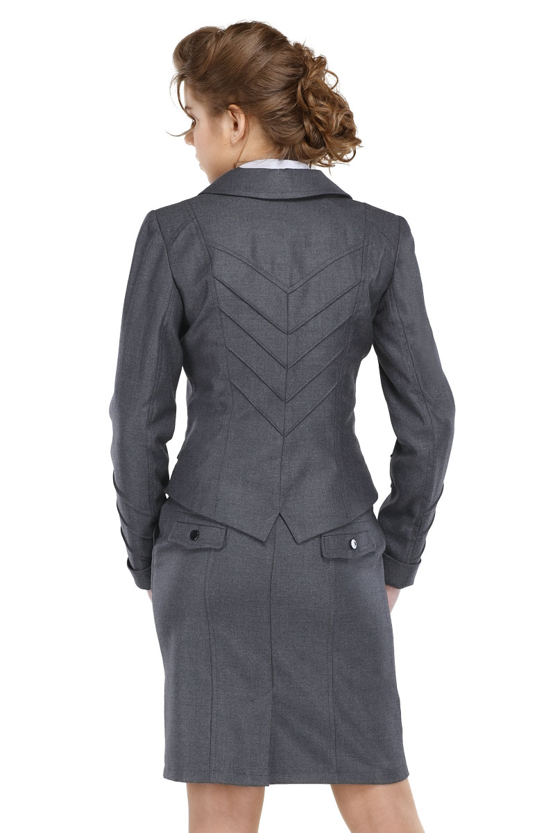 Пиджак приталенного кроя и ассиметричной длины дополнен двумя карманами с клапанами на пуговицах. Полочка изделия отличается своей оригинальностью, т.к. оформлена отложным воротником с острыми бортами и диагональной застежкой на пуговицы. Длинные рукава с манжетами, полочка и спинка декорированы встречными фигурными рельефами.
