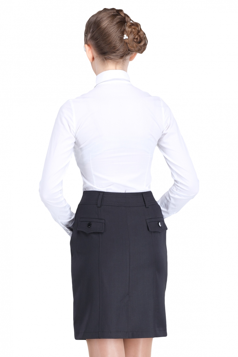 Стильная школьная юбка прямого силуэта. Линия талии подчёркнута фигурным поясом со шлевками. Изделие дополнено двумя боковыми карманами и двумя карманами сзади с клапанами на пуговицах. Изделие застегивается на потайную молнию сбоку. Боковые карманы декорированы фигурными рельефами, которые подчеркивают девичий силуэт.
