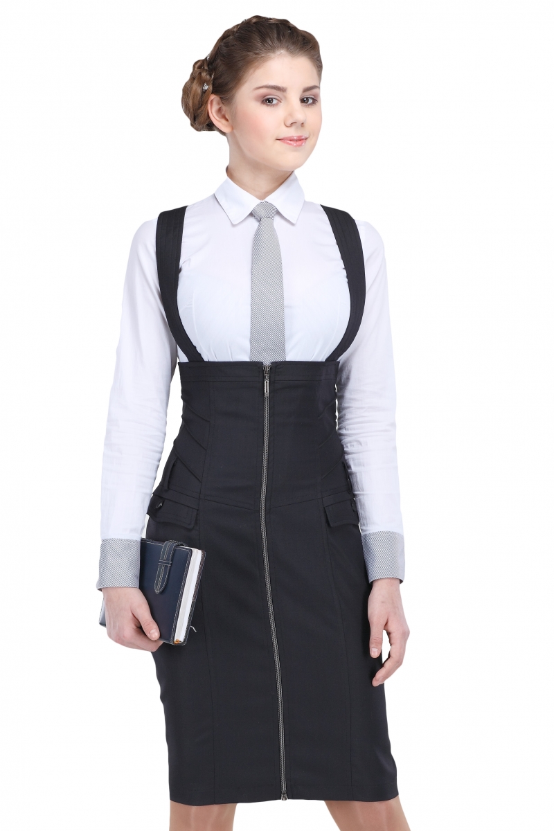 Ультрамодный сарафан на шлейках. Косые вытачки по бокам и вертикальные фигурные рельефы с контрастной строчкой подчеркивают девичий силуэт. Модель дополнена двумя декоративными клапанами на пуговицах, центральная застежка на молнии.
