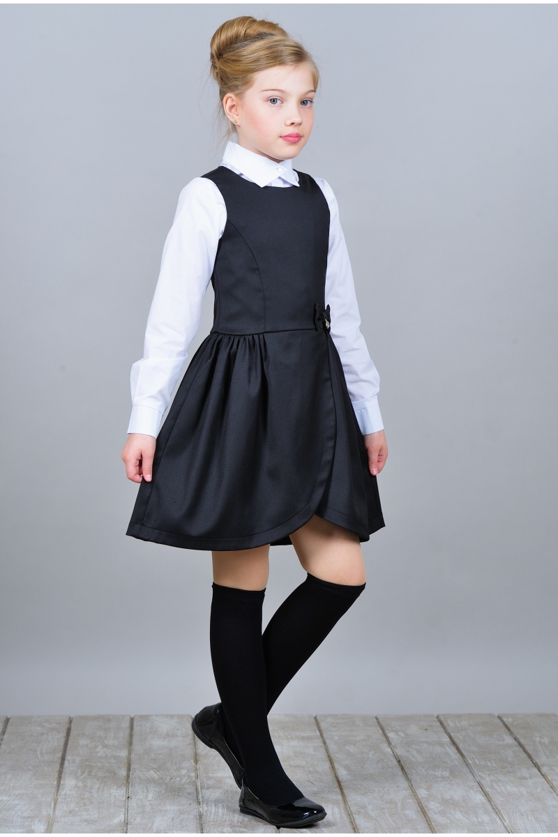 Элегантный школьный сарафан приталенного силуэта. Модель с круглым вырезом и юбкой «тюльпан» застегивается на молнию на спинке. Изделие декорировано милым бантом, расположенным по линии талии.