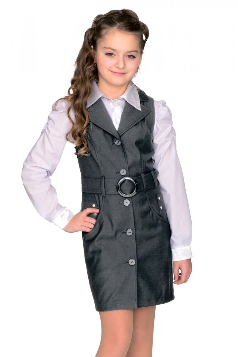 Стильный школьный сарафан с застежкой на пуговицы по всей длине изделия. Модель с отложным воротником дополнена двумя боковыми карманами и двумя карманами сзади. Фигурные рельефы и пояс с пряжкой, продетый в шлевки, подчеркивают приталенный силуэт.