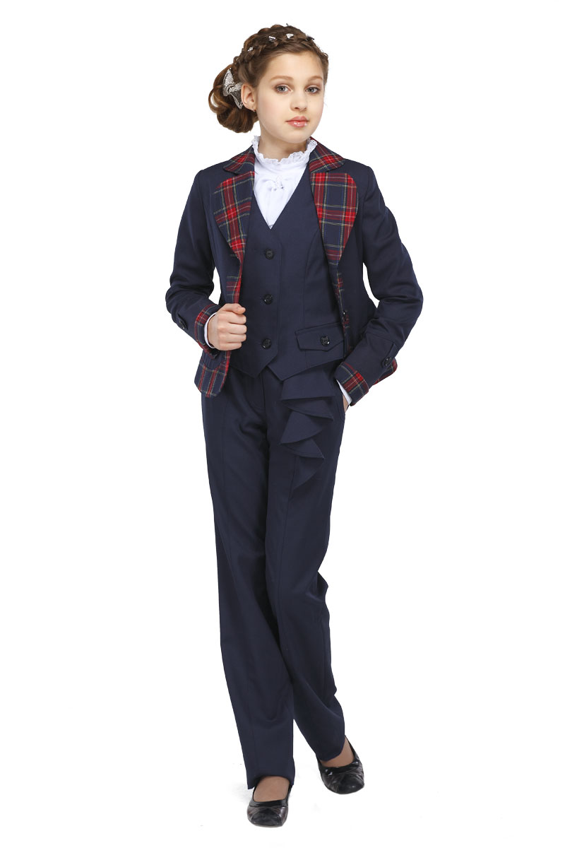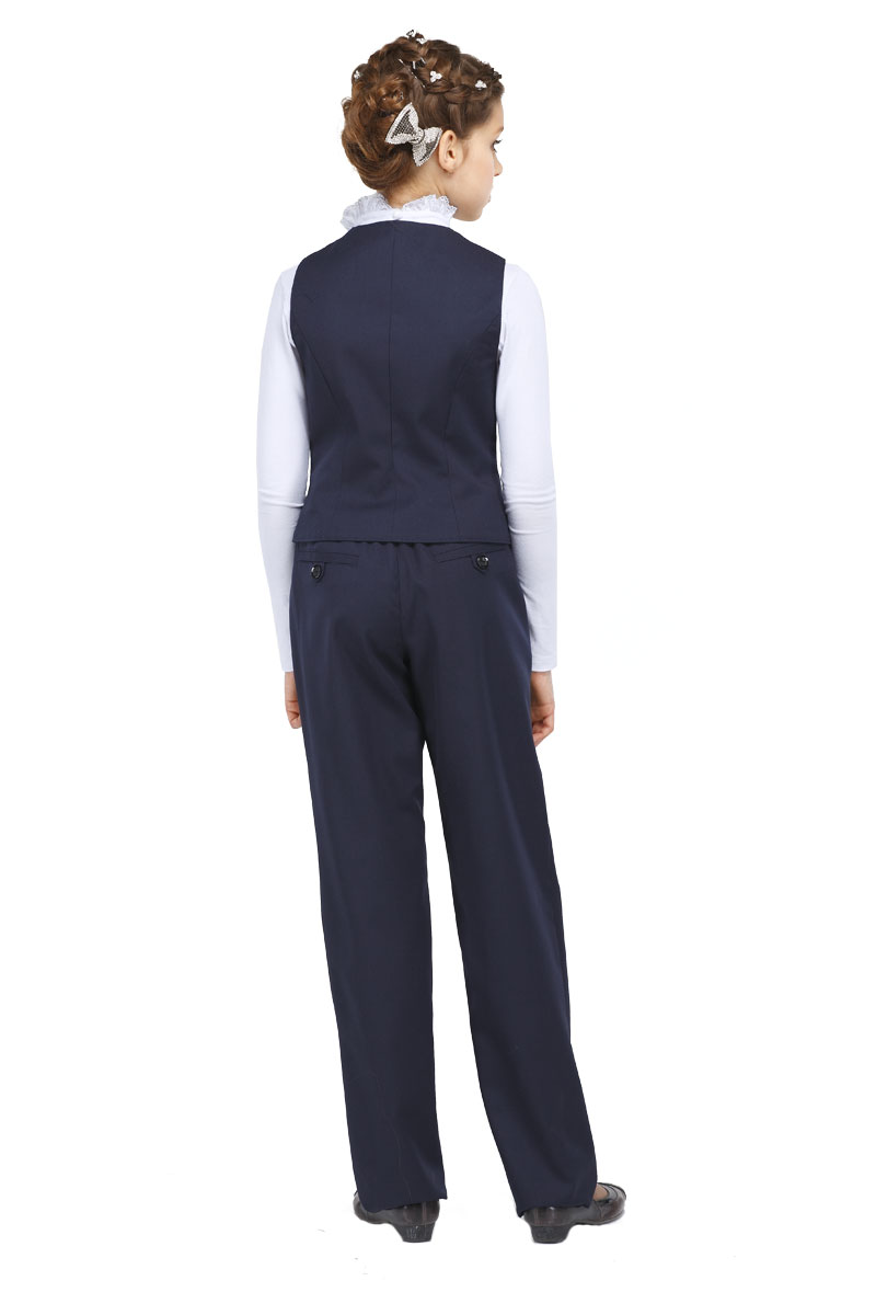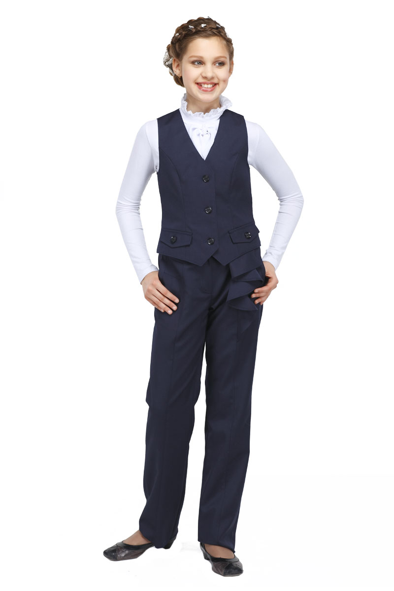 Оригинальные брюки прямого фасона для девочек. Линия талии подчеркнута аккуратным поясом со шлевками, модель дополнена функциональным боковым накладным карманом. Оригинальности изделию придают фигурные рельефы на передней половине брюк и декоративный ассиметричный волан.