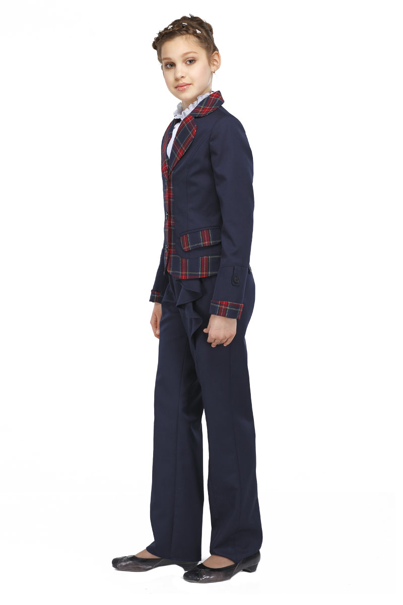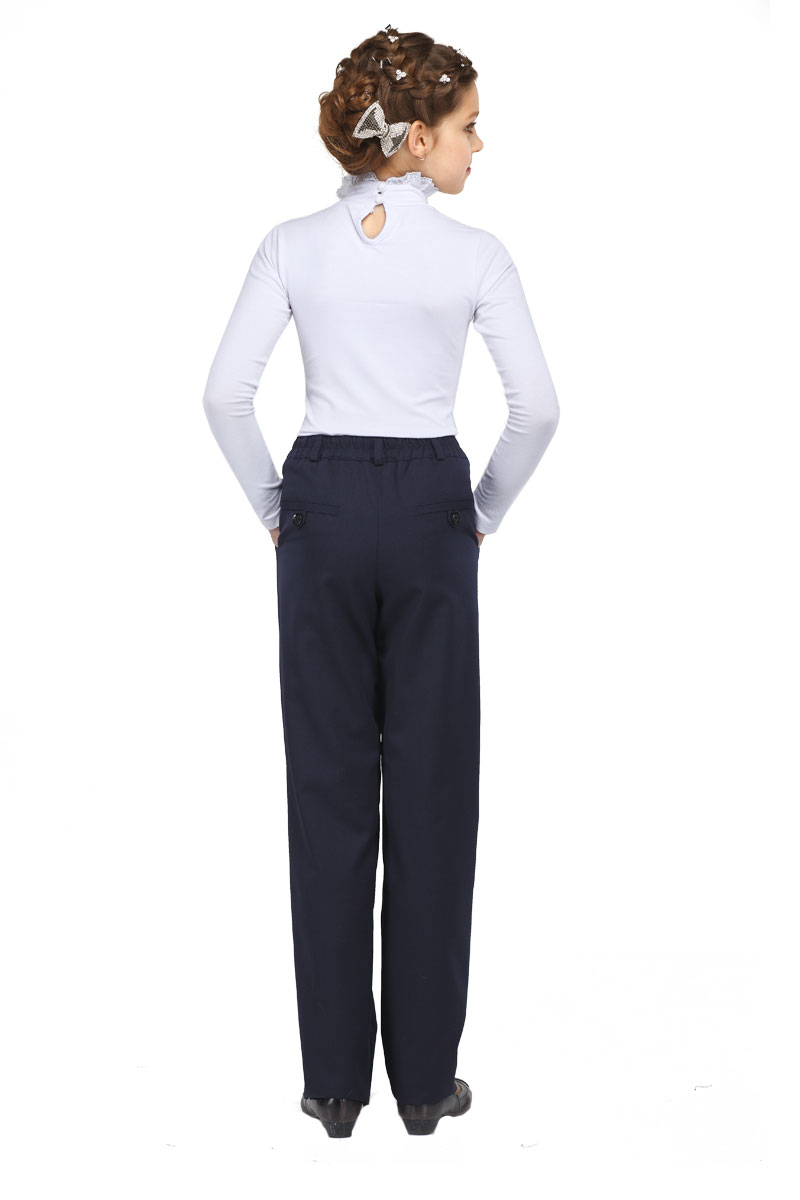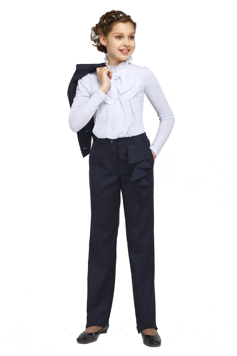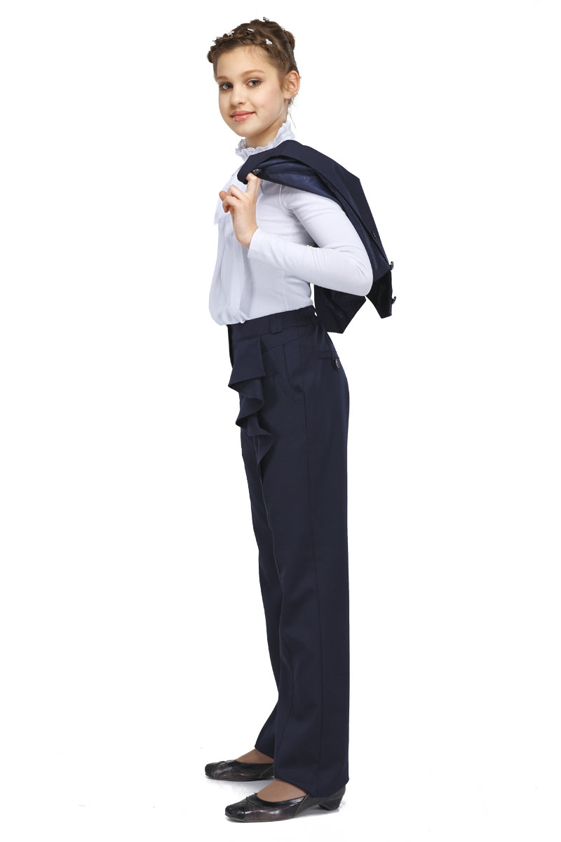 Оригинальные брюки прямого фасона для девочек. Линия талии подчеркнута аккуратным поясом со шлевками, модель дополнена функциональным боковым накладным карманом. Оригинальности изделию придают фигурные рельефы на передней половине брюк и декоративный ассиметричный волан.