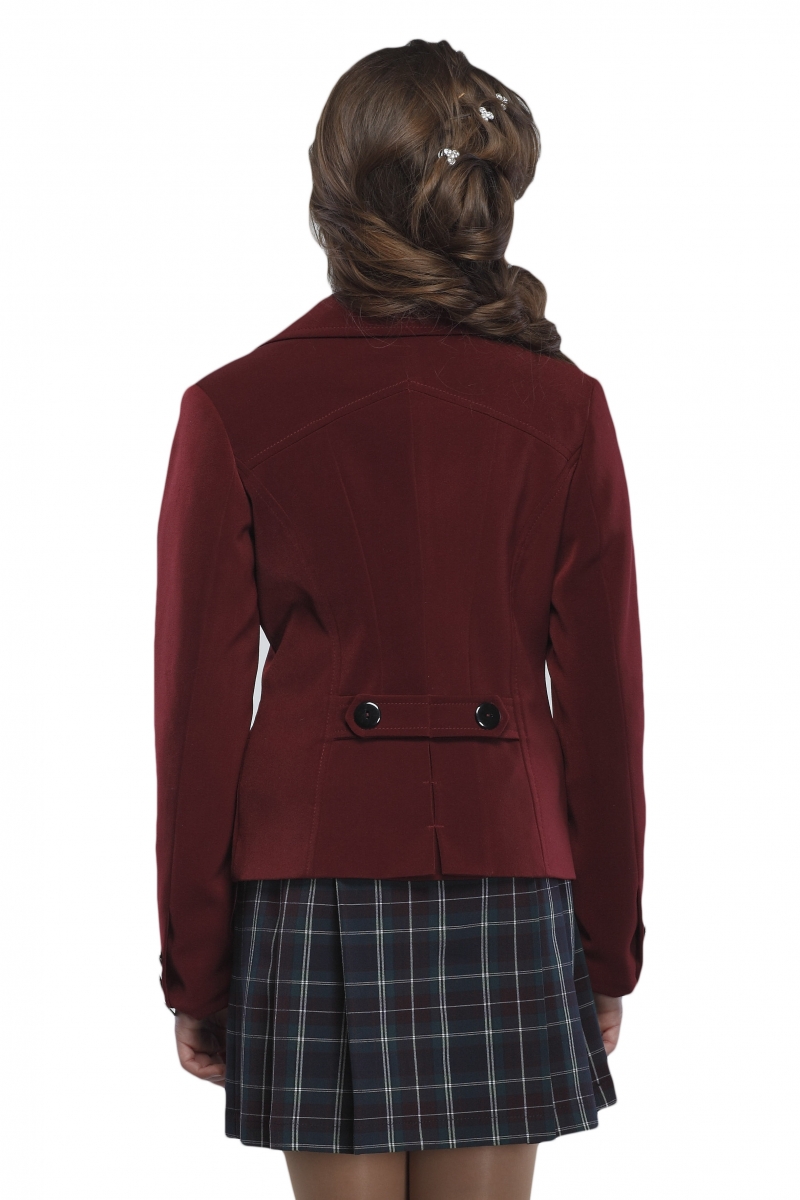 Стильный школьный костюм двойка для девочек. Пиджак с отложным воротником, длинными рукавами застегивается на пуговицы, которые расположены в два ряда. Изделие дополнено двумя карманами с листочками, от которых исходят складки. Фигурные рельефы, хлястик с пуговицами на спине подчеркивают приталенный силуэт.