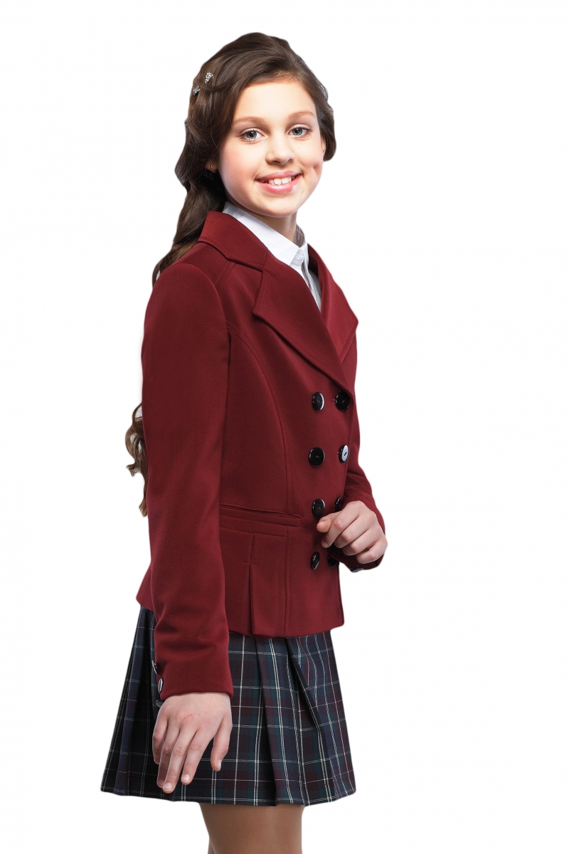 Пиджак с отложным воротником, длинными рукавами застегивается на пуговицы, которые расположены в два ряда. Изделие дополнено двумя карманами с листочками, от которых исходят складки. Фигурные рельефы, хлястик с пуговицами на спине подчеркивают приталенный силуэт.