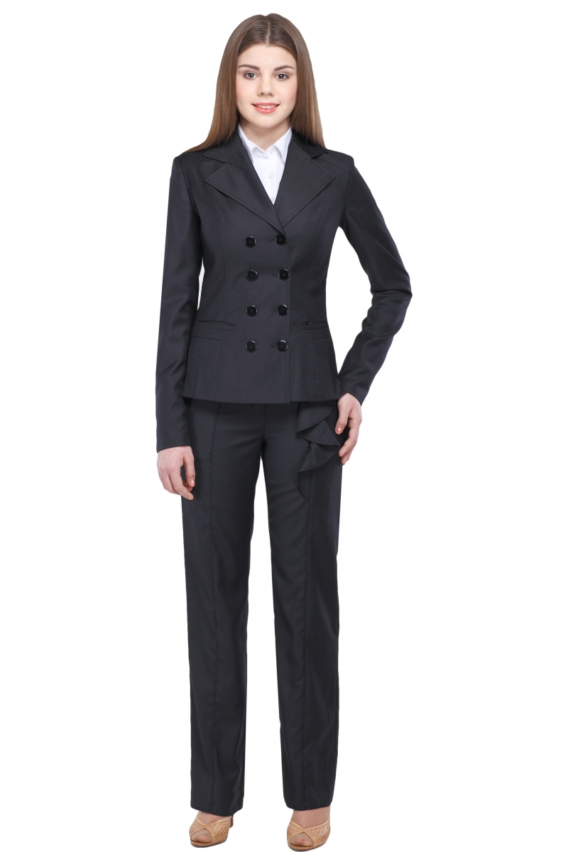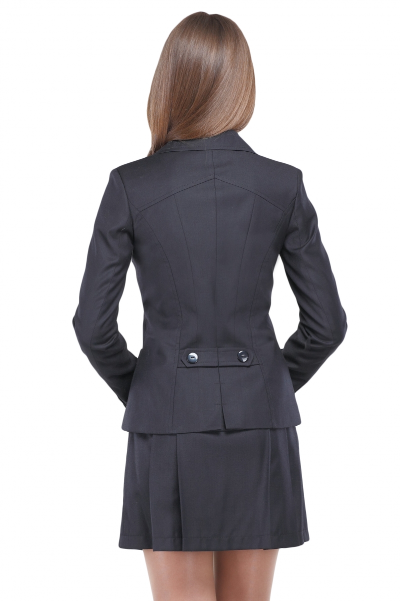 Пиджак с отложным воротником, длинными рукавами застегивается на пуговицы, которые расположены в два ряда. Изделие дополнено двумя карманами с листочками, от которых исходят складки. Фигурные рельефы, хлястик с пуговицами на спине подчеркивают приталенный силуэт.