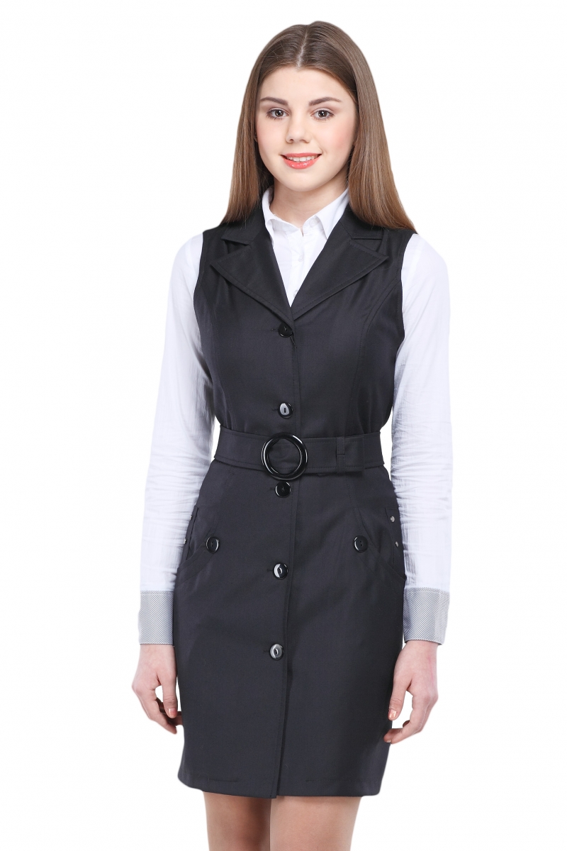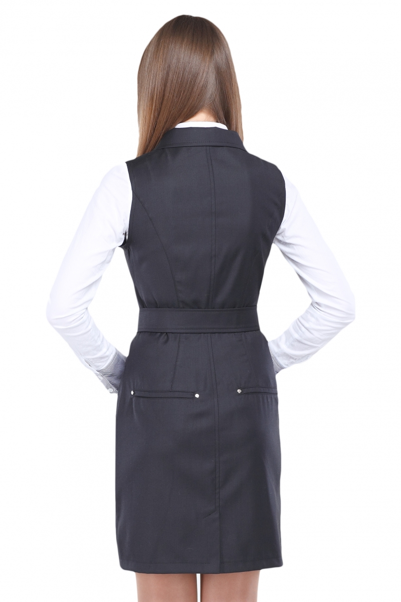 Стильный школьный сарафан с застежкой на пуговицы по всей длине изделия. Модель с отложным воротником дополнена двумя боковыми карманами и двумя карманами сзади. Фигурные рельефы и пояс с пряжкой, продетый в шлевки, подчеркивают приталенный силуэт.