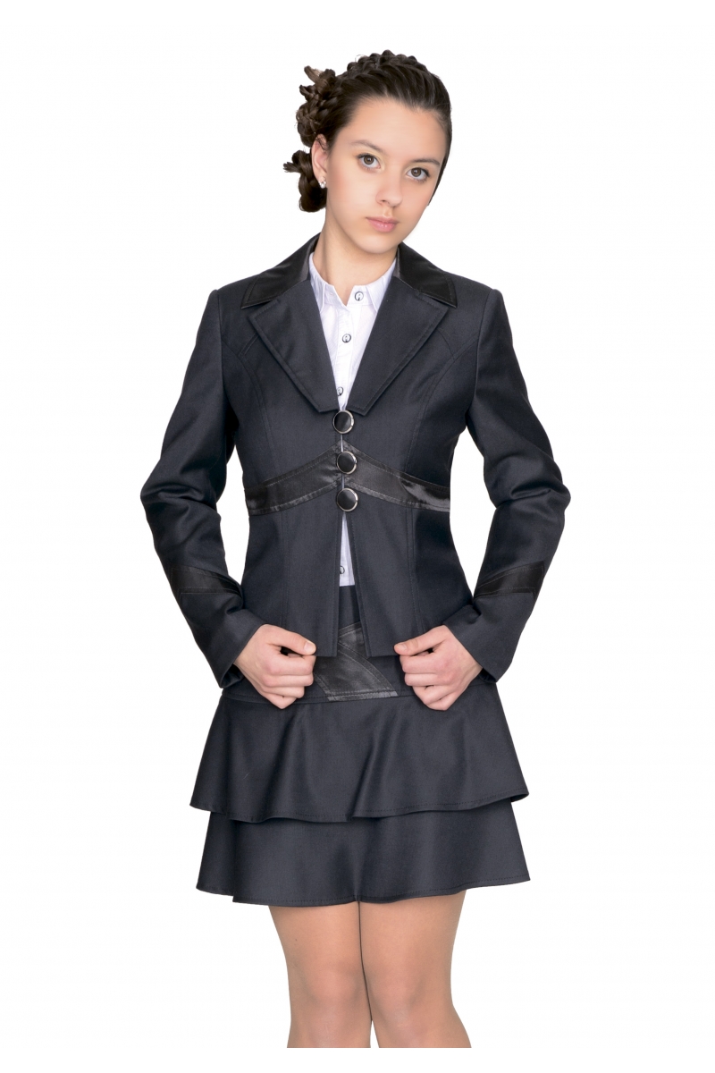 Пиджак приталенного кроя с фигурным отложным воротником, длинными рукавами с манжетами застегивается на молнию. Изделие декорировано фигурными рельефами, воротник, полочка, рукава и спинка декорированы атласной лентой.