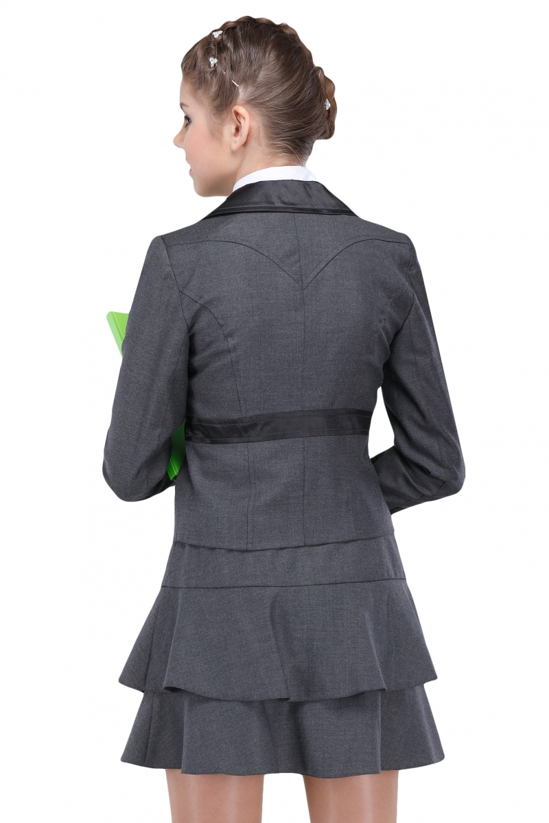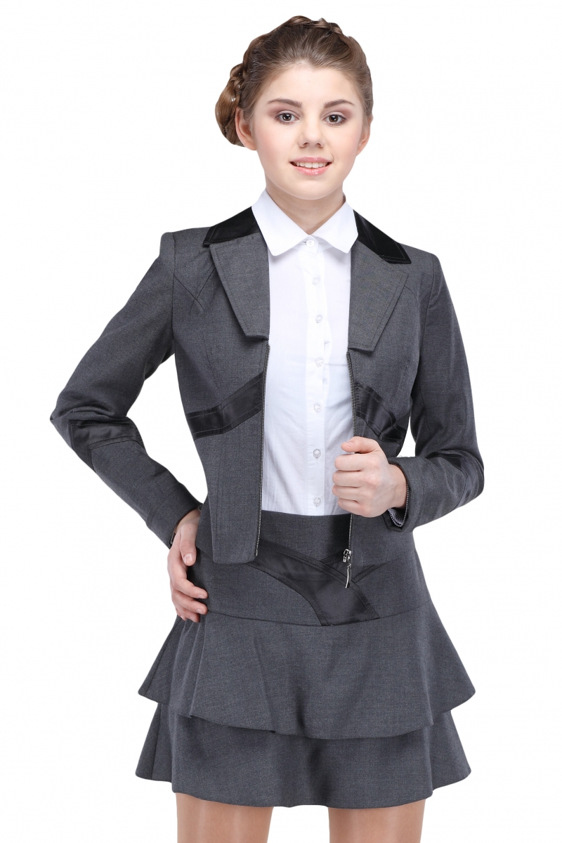 Стильная школьная юбка на широкой кокетке с исходящими от неё многослойными воланами. Изделие декорировано атласной лентой, застегивается на потайную молнию сбоку.